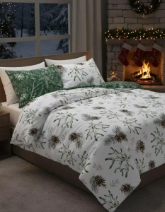 Scandic 083 Scandic Faro biała i zielona z szyszkami– pościel świąteczna dwustronna, bawełna 100%, komplet