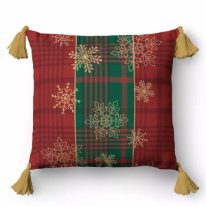 5382 A Christmas Deco Detexpol krata czerwona i zielona ze złotymi śnieżynkami– poszewka dekoracyjna świąteczna 45x45, Panama, zamek błyskawiczny