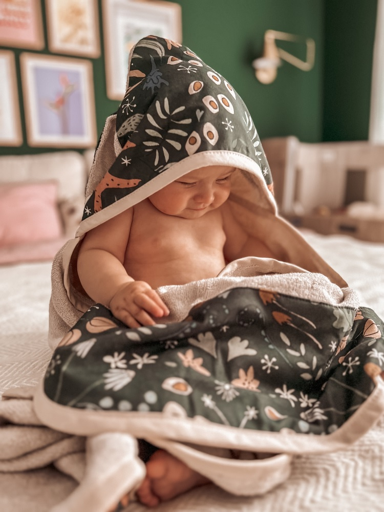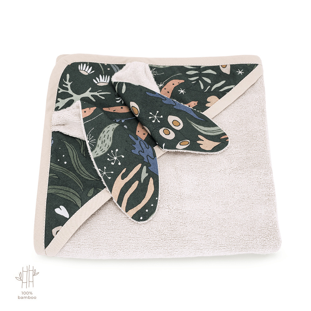 Sprawdzi się również na basenie, czy na plaży, otuli i ogrzeje delikatną skórę dziecka. Posiada praktyczny kapturek ze wzorem kolekcji, na kapturku przesłodkie uszka, a cały jest obszyty elegancką lamówką. W górnym rogu ręczniczek ma troczek ułatwiający zawieszenie.