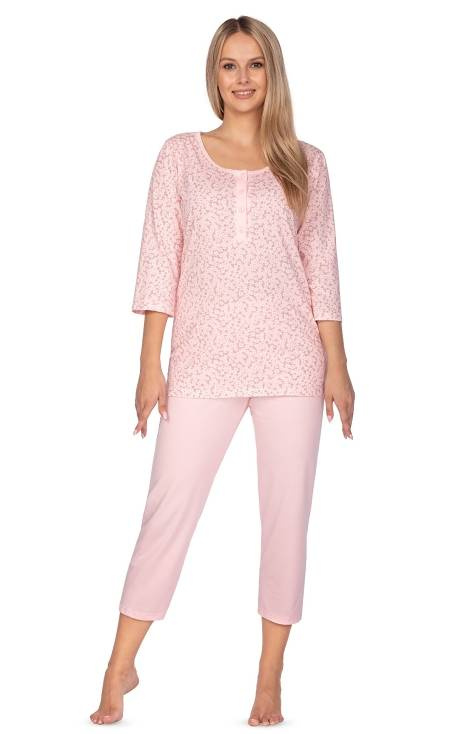 Bawełniana piżama z rękawkiem 3/4 oraz ozdobnym nadrukiem kwiatków. Do kompletu rybaczki. Dekolt zapinany na guziki.