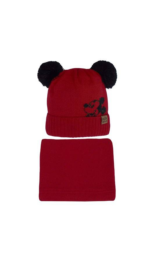 Model czapki z nadrukiem "Myszki Miki" z dwoma pomponami.