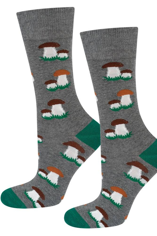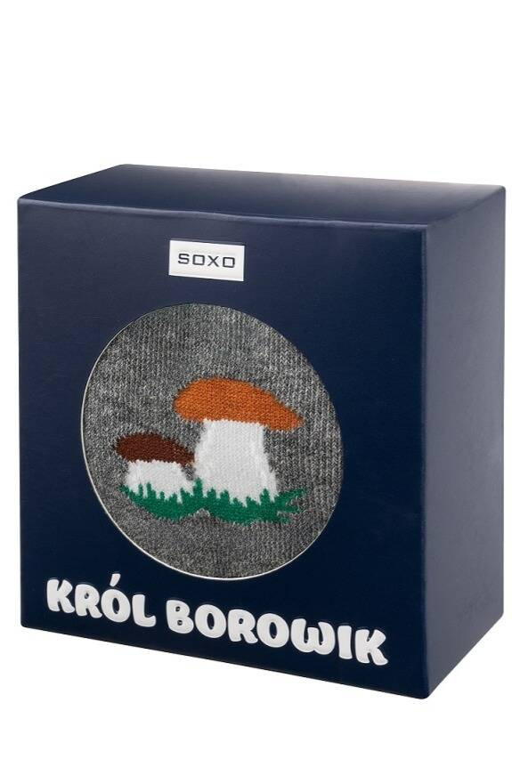 Wzorzyste skarpety wykonane z wysokogatunkowej bawełny. Model z motywem grzybów. Zapakowane w efektowne pudełko prezentowe.