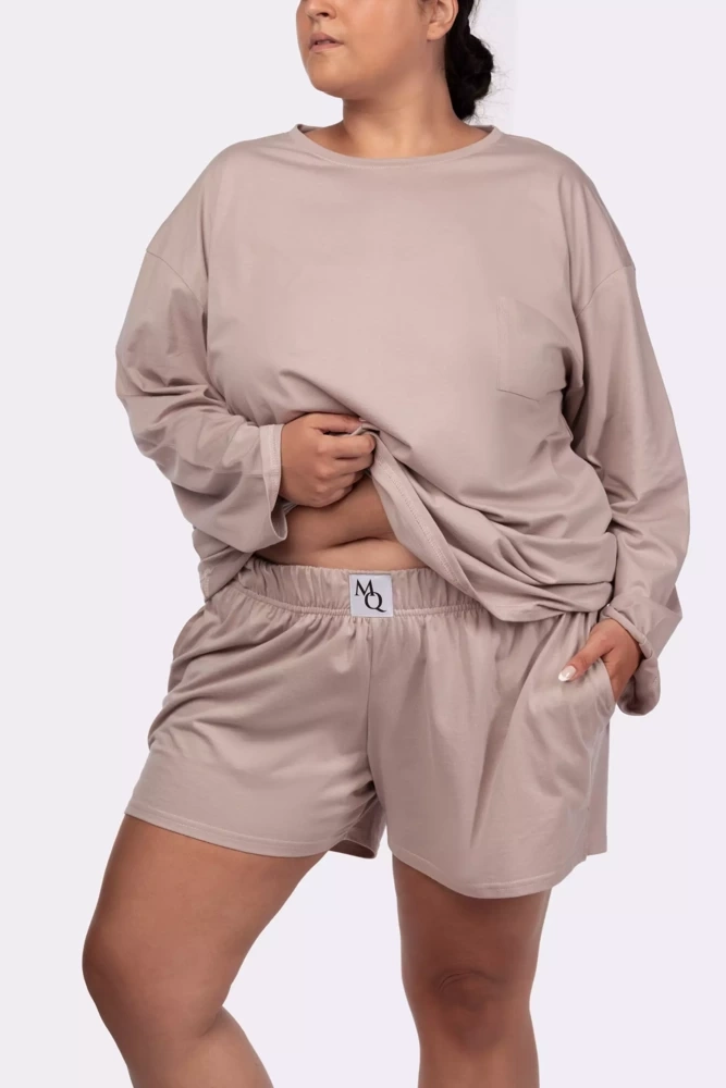 Model z oversizową, wygodną koszulką oraz krótkimi spodenkami podkreślającymi nogi. Spodenki mają nieco wyższy stan oraz szeroką gumę w pasie. Wykonana z niezwykle delikatnej i przewiewnej bawełny, zapewniającej komfort podczas snu.