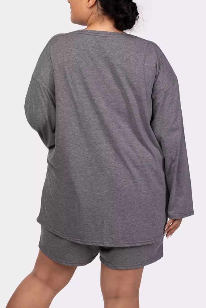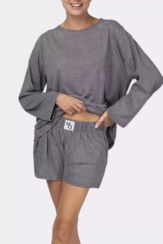 Model z oversizową, wygodną koszulką oraz krótkimi spodenkami podkreślającymi nogi. Spodenki mają nieco wyższy stan oraz szeroką gumę w pasie. Wykonana z niezwykle delikatnej i przewiewnej bawełny, zapewniającej komfort podczas snu.