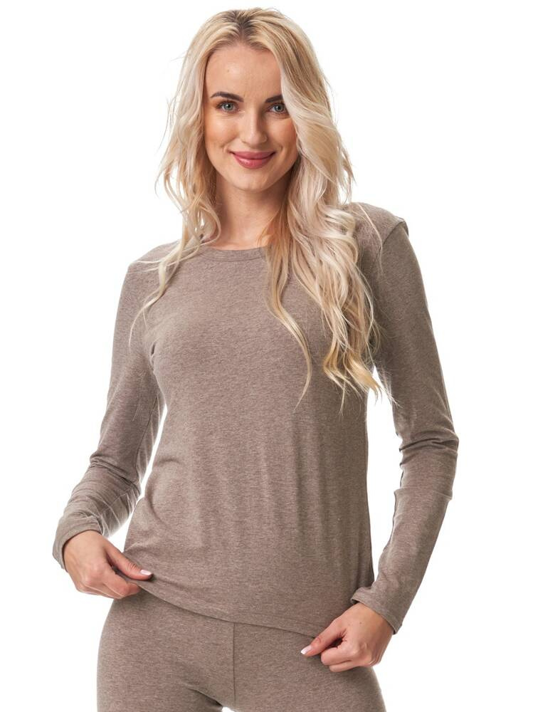 Klasyczna koszulka damska wykonana z miękkiej, melanżowej dzianiny, z długim rękawem.