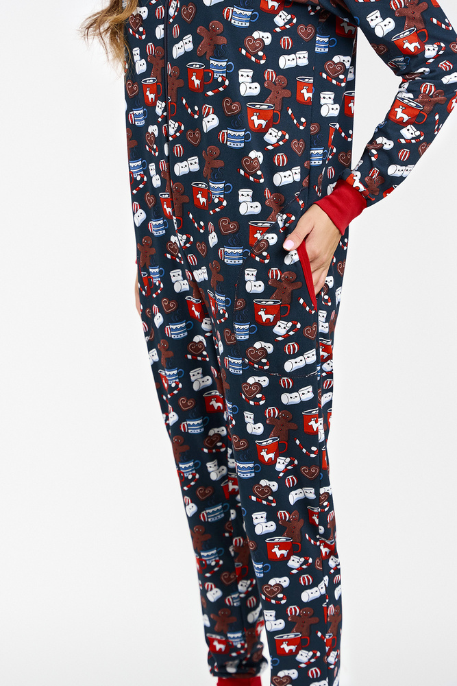 Kombinezon o luźnej linii z kapturem i kieszeniami. Zapinany na zamek błyskawiczny. W dole rękawów i nogawek ściągacze.