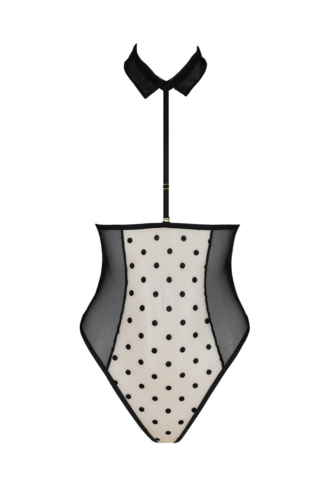 Prezentowany model odkrywa w całości piersi. Wiązanie gorsetowe w tylnej części, wpływa na komfort noszenia. Całości charakteru dodaje, seksowny, odpinany choker w postaci kołnierzyka. Model dostępny w dwóch wersjach kolorystycznych - czerni i beżu.