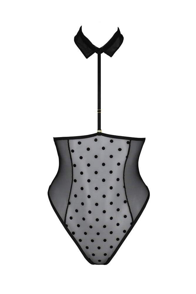 Prezentowany model odkrywa w całości piersi. Wiązanie gorsetowe w tylnej części, wpływa na komfort noszenia. Całości charakteru dodaje, seksowny, odpinany choker w postaci kołnierzyka. Model dostępny w dwóch wersjach kolorystycznych - czerni i beżu.