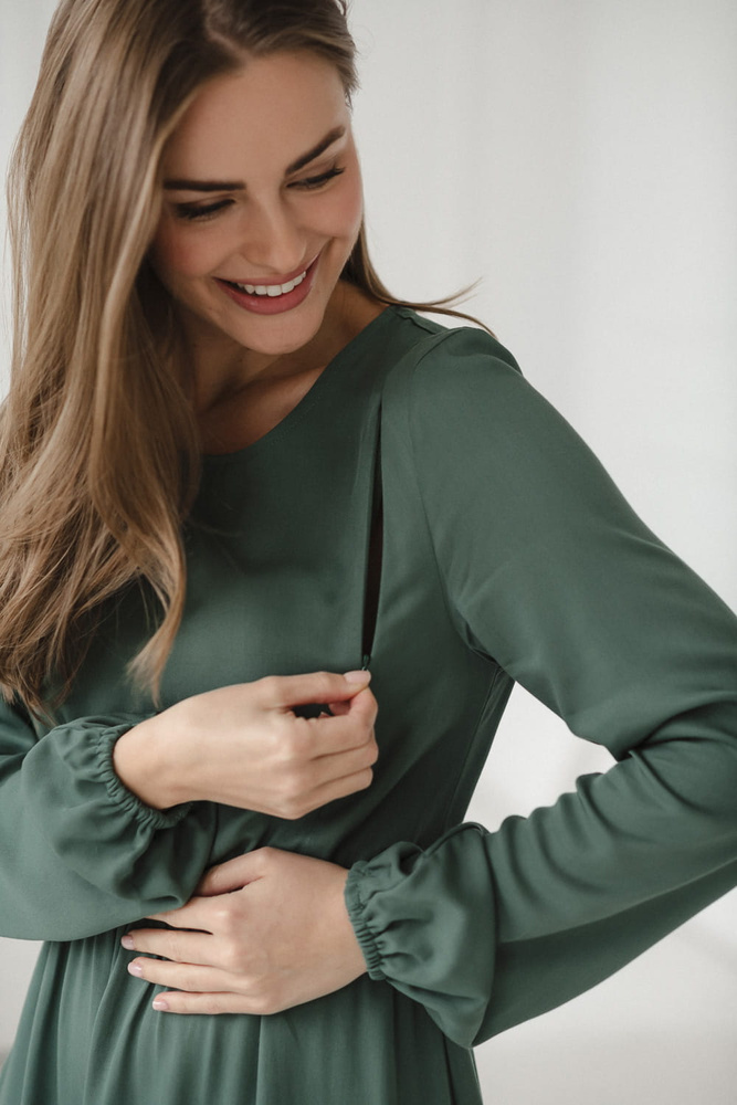 Sukienka dla mamy karmiącej piersią z falbankami, pod którymi ukryliśmy zamki, które otwierają się od góry. Model na czas ciąży i później do karmienia piersią z modnymi, rozszerzanymi rękawami. Z gumką pod biustem, dzięki czemu pięknie się układa i na brzuszku ciążowym i po porodzie