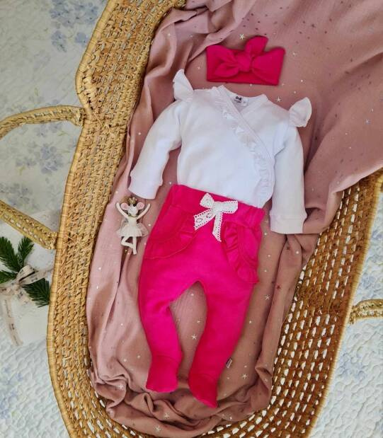 Komplet Jasmina, z kolekcji która jest niebanalna i dedykowana dla małych brzdąców. W komplecie znajduje się body kimono w białym kolorze, zapinane na 2 napki, wygodne półśpioszki.