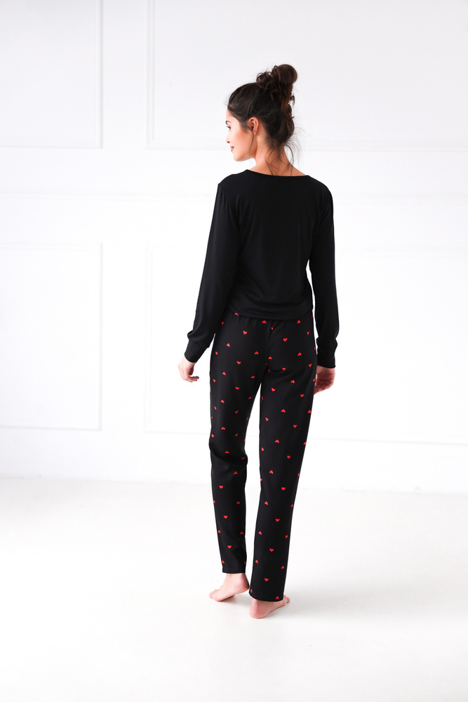Komfortowa piżama damska. Uszyta z wysokogatunkowej wiskozy, która daje maksymalny komfort noszenia. Koszulka jednolita z długim rękawem. Do kompletu długie wzorzyste spodnie. Całość prezentuje się doskonale. Bardzo wygodny fason, delikatnie dopasowany do ciała. Spodoba się kobietom, które uwielbiają delikatność i swobodę.