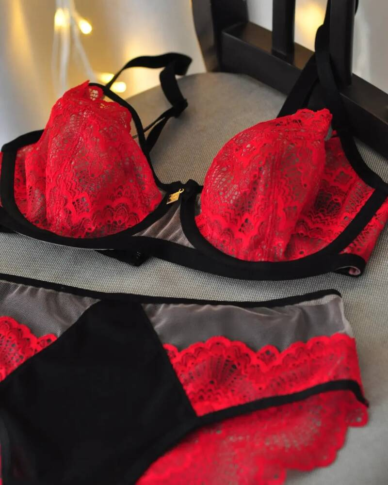 Biustonosz miękki idealnie zbierający piersi. Miseczki wykonane z siatki, na którą została naszyta czerwona koronka, miseczki wykończone czarną lamówką.
