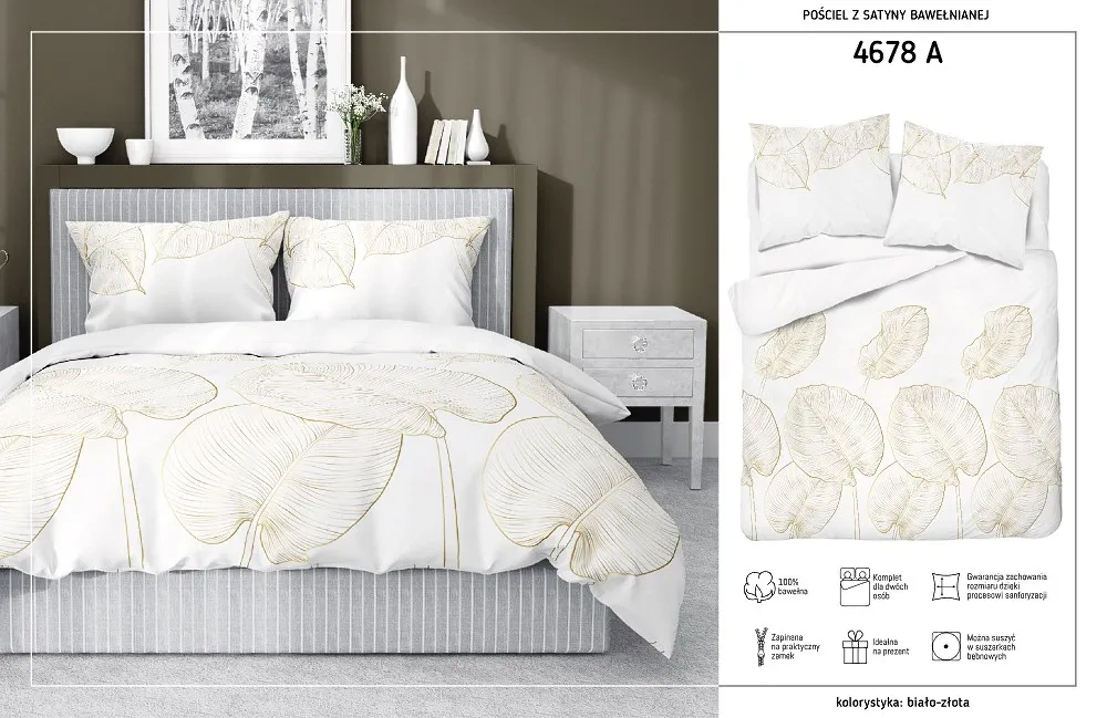 Tkanina stosowana do produkcji kompletów pościeli wykonana jest z wysokiej jakości przędz, co w połączeniu z nowoczesnym wzornictwem i odpowiednio nasyconą kolorystyką, daje produkt o bardzo wysokiej jakości. Interesujące nadruki idealnie wkomponują się w każde wnętrze.  Miękki materiał satyny bawełnianej gwarantuje odprężenie i wypoczynek w trakcie snu.