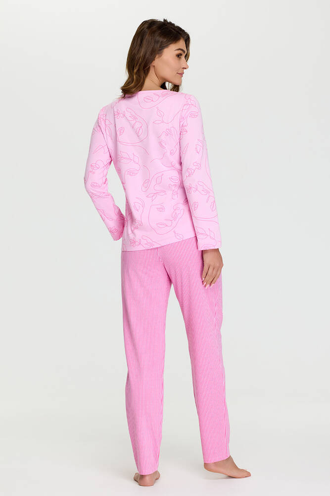 Model o swobodnym kroju. Koszulka z krótkim rękawem i okrągłym dekoltem. Na całości delikatny różowy wzór w kobiece twarze. W komplecie z długimi spodniami w paski, zwężanymi u dołu. W pasie delikatna guma.