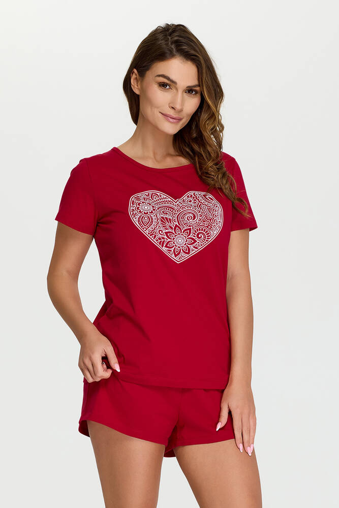 Model o swobodnym kroju. Koszulka z krótkim rękawem i okrągłym dekoltem. Na przodzie ozdobny print serce. W komplecie z krótkimi spodenkami. W pasie delikatna guma.