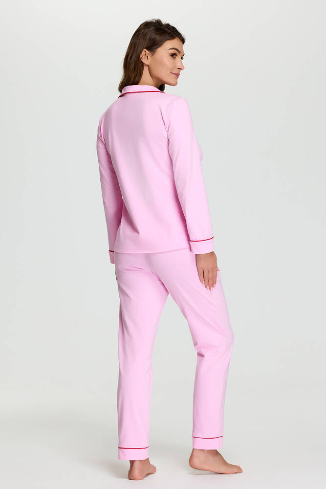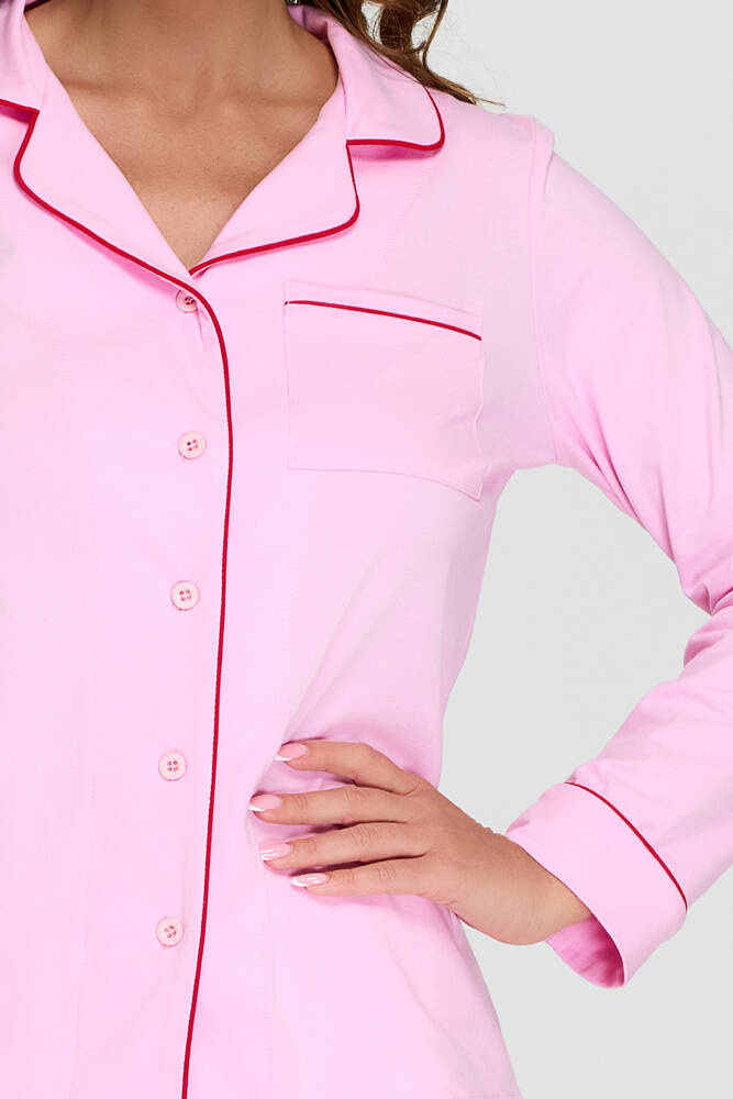Klasyczna piżama damska.Koszula z kołnierzykiem wykończona kontrastową, czerwoną wypustką. Zapinana na guziki. Długie rękawy zakończone mankietami. Kieszeń na wysokości piersi. W komplecie z długimi spodniami. Posiadają kieszenie. Nogawki o prostym kroju. U dołu bawełniana wypustka. Gumka w pasie.