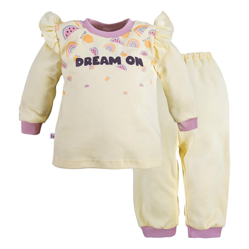 Piżama dziecięca uszyta z miękkiej i przyjemnej w dotyku kolorowej dzianiny. Góra piżamki z nadrukiem i falbanką. Długie spodenki są gładkie. W pasie spodni wszyta guma nie uwierająca brzuszka dziecka. Piżamki z długimi spodniami i rękawami idealnie sprawdzą się w chłodne jesienne i zimowe wieczory.