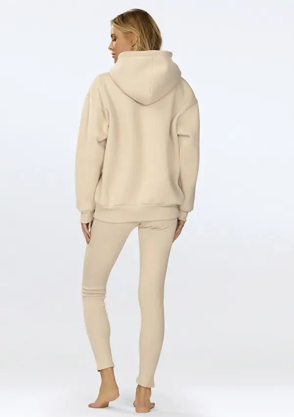 Komplet sportowy składający się z ciepłej bluzy z kapturem oraz legginsów w prążki. Zestawienie zapewnia nie tylko modny look, ale także optymalne wsparcie dla aktywnego trybu życia. Komplet dostępny jest w wielu kolorach, więc możesz wybrać ten, który najlepiej pasuje do Twojego stylu.