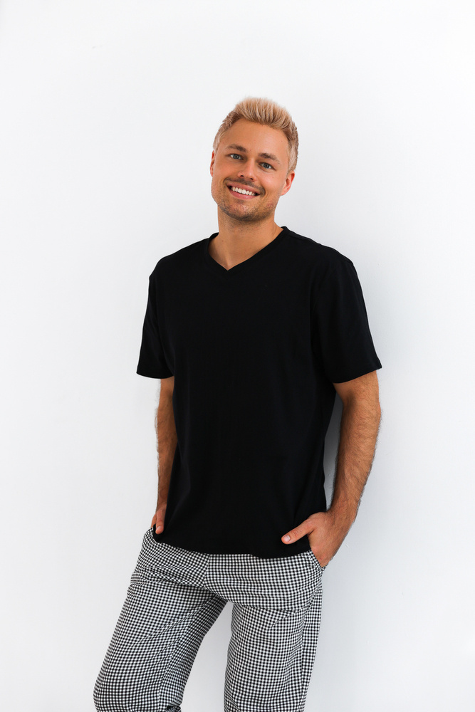 Piżama męska wykonana z wysokiej jakości bawełny. Bluzeczka z krótkim rękawem. Do kompletu długie, wzorzyste spodnie. W pasie wygodna, nieuciskająca guma. Bardzo stylowy fason.