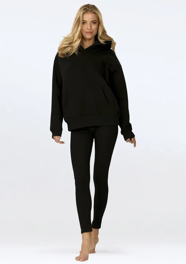 Komplet sportowy składający się z ciepłej bluzy z kapturem oraz legginsów w prążki. Zestawienie zapewnia nie tylko modny look, ale także optymalne wsparcie dla aktywnego trybu życia. Komplet dostępny jest w wielu kolorach, więc możesz wybrać ten, który najlepiej pasuje do Twojego stylu.
