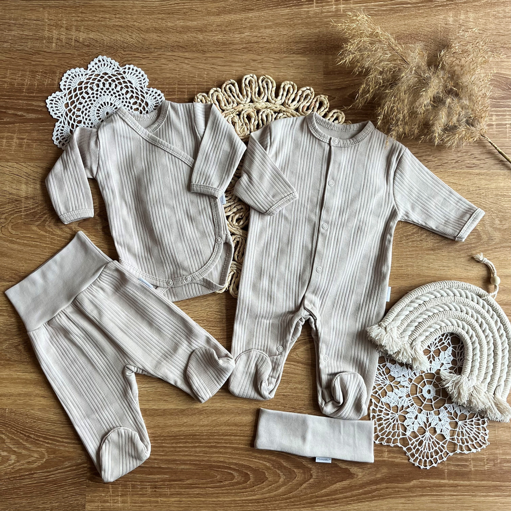 Mamy do zaoferowania komplet niemowlęcy, który składa się z body, półśpiochów, pajaca, opaski. Ubranka zostały wykonane z wysokiej jakości 100% bawełny ozdobione nadrukiem, miłe i przyjemne w dotyku sprawią poczucie bezpieczeństwa.