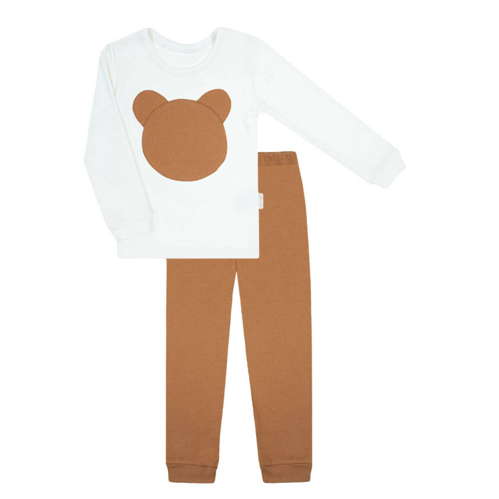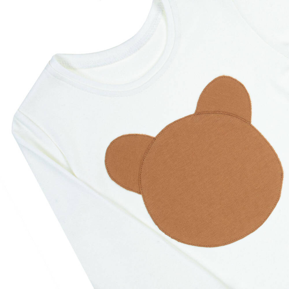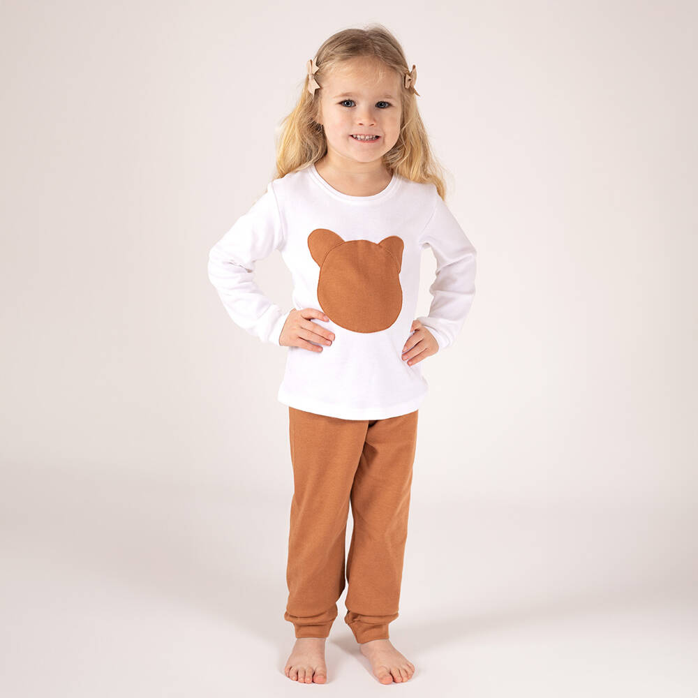 Wygodna piżamka składająca się z bluzeczki oraz spodenek. Bluzeczka ozdobiona miśkiem. Spodenki wyposażone są w delikatną gumkę, która sprawia, że ubranko pozostaje na swoim miejscu. Piżamka sprawdzi się w czasie snu nieco większych maluchów.
