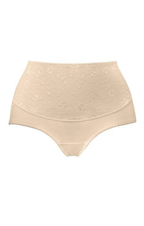 Figi modelujące ozdobione koronką. Konstrukcja zapewnia wygodę w codziennym noszeniu Wykonane z bawełny, przód wzmocniony poliamidem z dodatkiem elastanu.