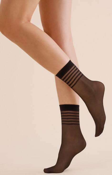 Cienkie skarpetki 20 den ozdobione delikatnym wzorem w paski. Posiadają wygodny, nieuciskający ściągacz.