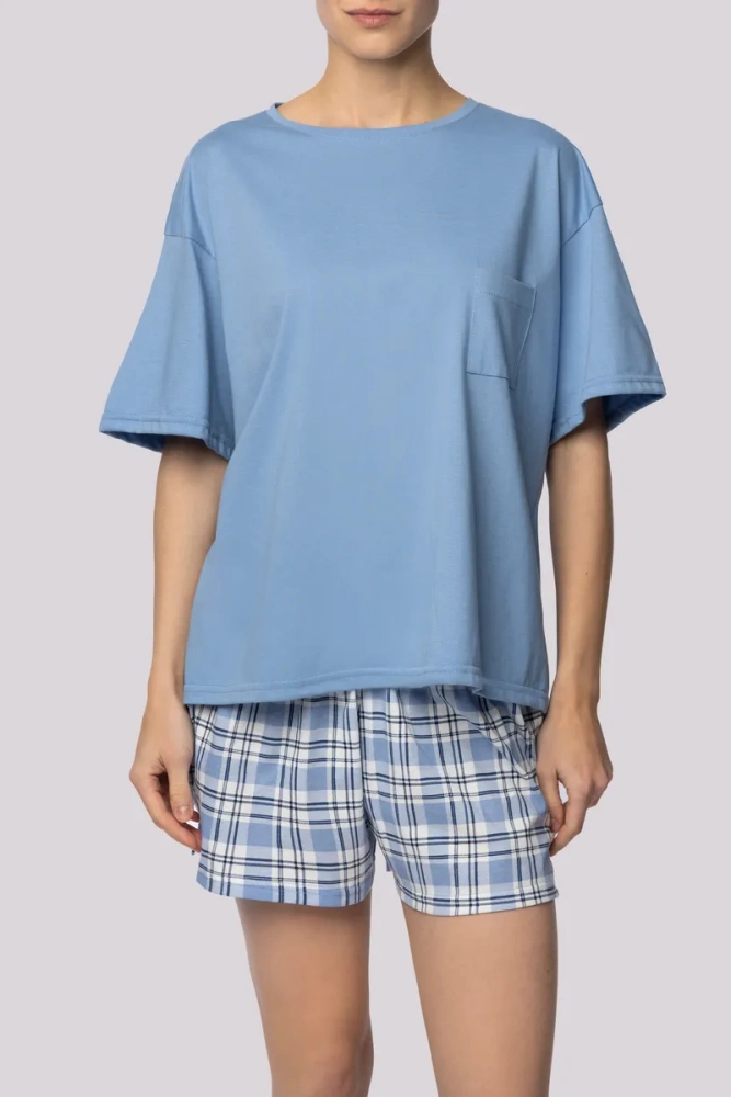 Model z oversizową, wygodną koszulką oraz krótkimi spodenkami podkreślającymi nogi. Spodenki mają nieco wyższy stan oraz szeroką gumę w pasie. Wykonana z niezwykle delikatnej i przewiewnej bawełny, zapewniającej komfort podczas snu.