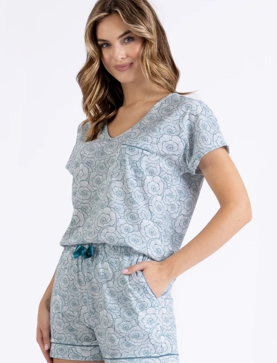 Efektowna piżama damska wykonana z delikatnej bawełny. Piżama damska z krótkim rękawem, uszyta z wzorzystej bawełny. Dekolt w serek, z kieszenią na wysokości klatki piersiowej. Do kompletu szorty z mankietami oraz kieszeniami. W pasie ozdobna kokarda.