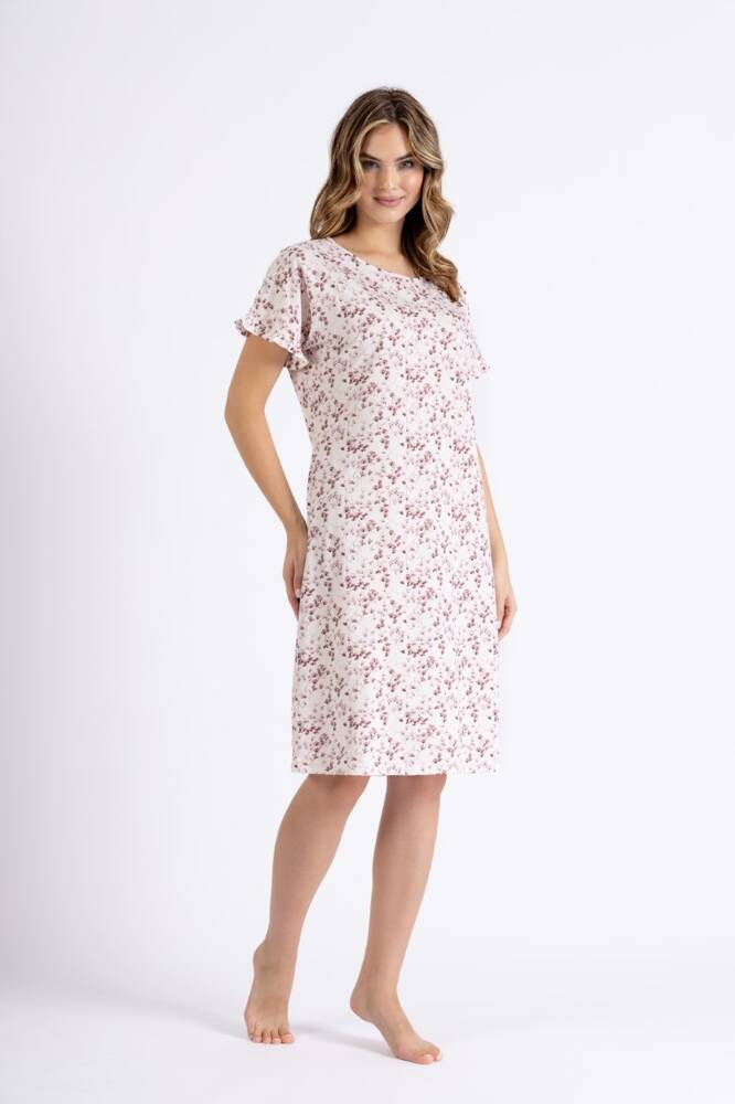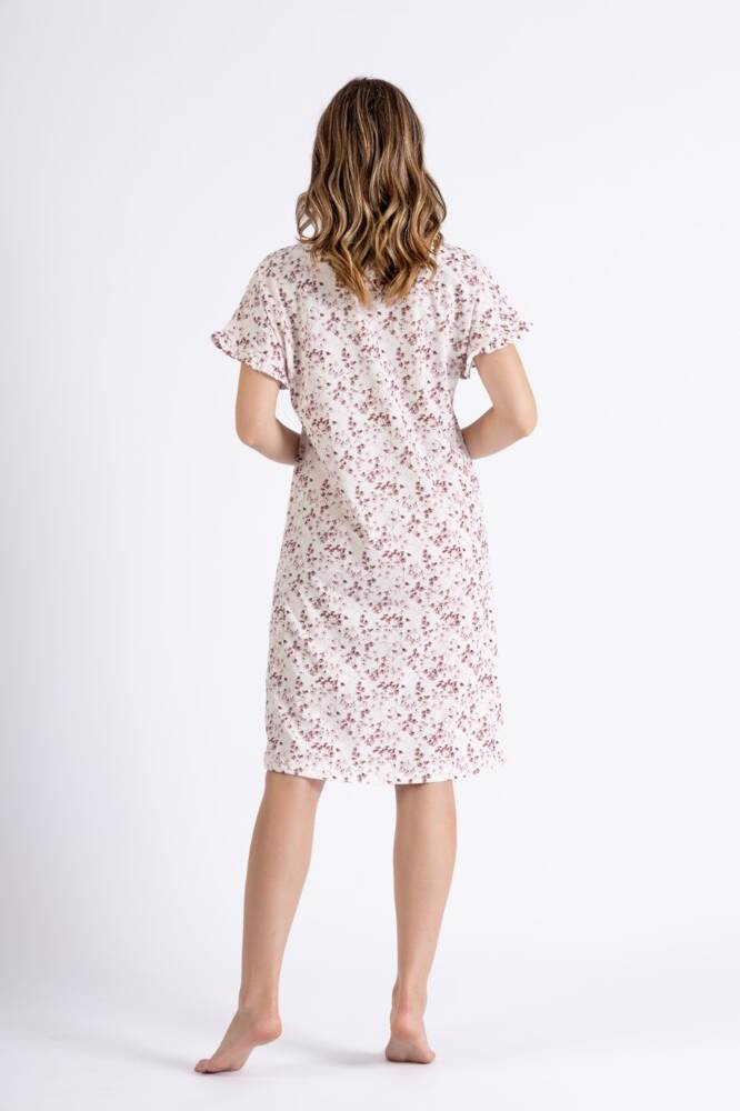 Wzorzysta koszula damska uszyta z wysokiej jakości bawełny. Uszyta z wysokiej jakości wzorzystej bawełny. Rękaw koszulki wykończony falbanka, długość koszuli do kolan.
