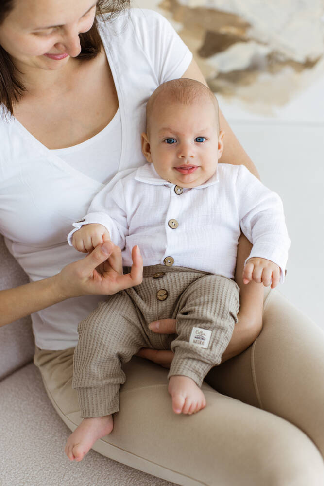 Wygodne spodnie dziecięce z guzikami. W pasie wszyty jest nieuciskający ściągacz, który utrzymuje ubranko na miejscu w trakcie codziennych aktywności. Anatomiczny fason zapewnia dziecku komfort noszenia i nie krępuje mu ruchów. Spodnie możesz swobodnie łączyć z pozostałymi ubrankami marki Makoma, tworząc każdego dnia ciekawe stylizacje.