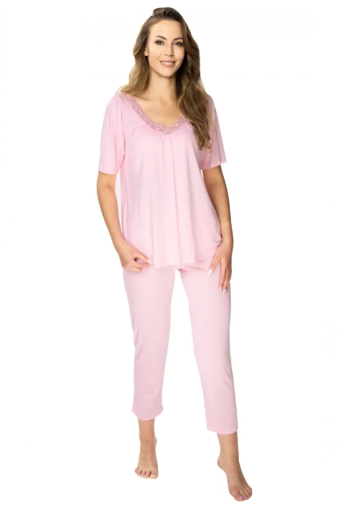 Dwuczęściowa piżama damska z letniej kolekcji Mewa Lingerie. Model wykonany z niezwykle miękkiej i przyjemnej dla ciała wiskozy. Góra z krótkim rękawem i praktycznym dekoltem wyciętym w kształt litery "V", ozdobiony miękką koronką. Spodnie o długości 3/4 i swobodnym kroju, na wygodnej gumie.