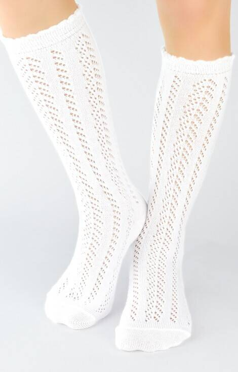 Dziewczęce podkolanówki ozdobione ażurowym wzorem.