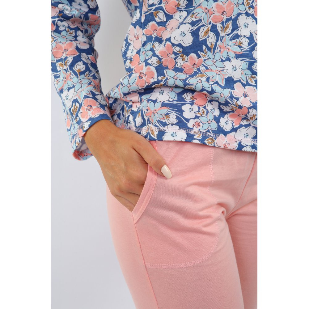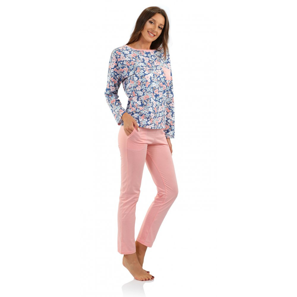 Piżama z długim rękawem i długimi spodniami. Delikatny wzór kwiatowy na koszulce z kieszonką, oraz pastelowe spodnie z kieszeniami nadają piżamie szyku. Pastelowe kolory nadają piżamie ponadczasowy charakter, a przemyślany krój zapewnia komfort użytkowania i sprawia, że wygląda wspaniale na każdej sylwetce. Idealna do spania i jako praktyczny strój domowy.