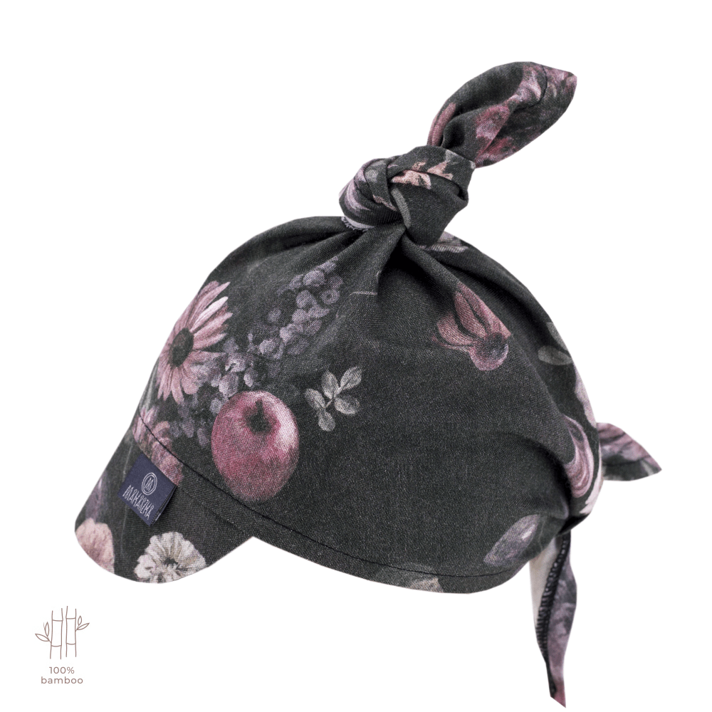 skład :100% wiskoza bambusowa najwyższej jakości. Daszek lekko usztywniony wszytą wewnątrz fizeliną. Posiada Certyfikat OEKO-TEX 100 klasa I. Wyjątkowe zalety tkanin bambusowych potwierdził Instytutu Matki i Dziecka wydając pozytywną opinię.