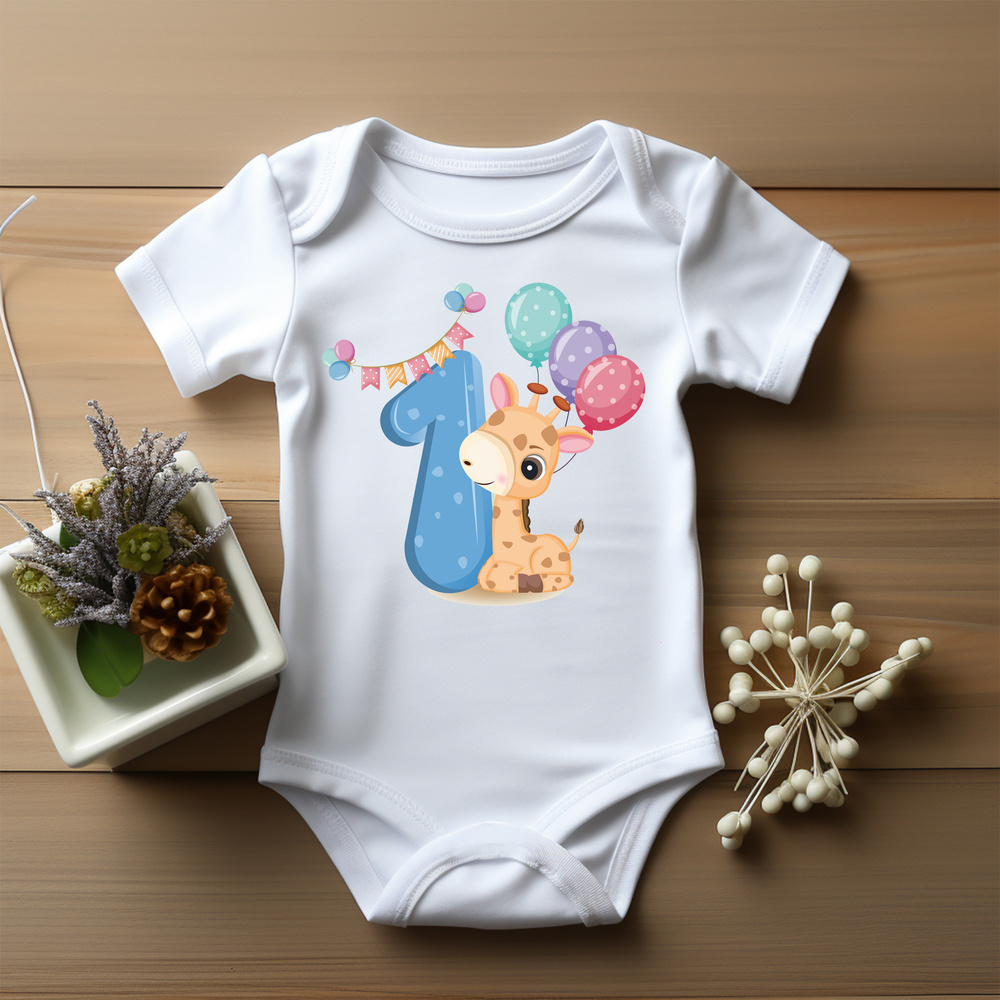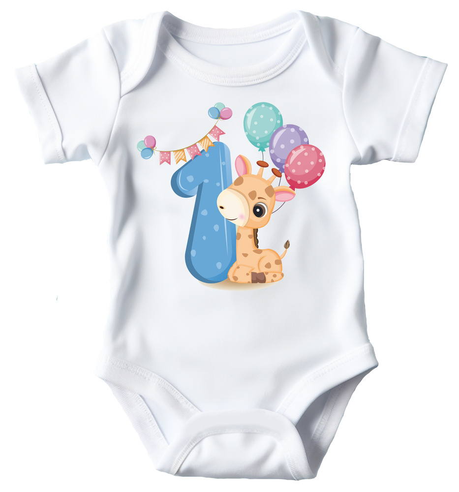 Body krótki rękaw "ROCZEK dla dziewczynki/chłopca z żyrafą i jedynką" Moocha biały
