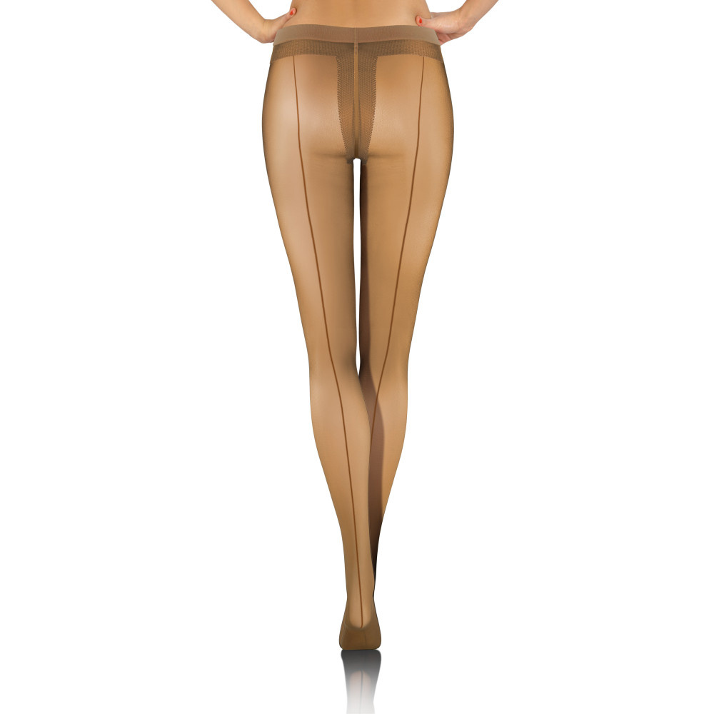 Cienkie, ekskluzywne rajstopy ze szwem z tyłu bez zaznaczonej części majtkowej i palców.