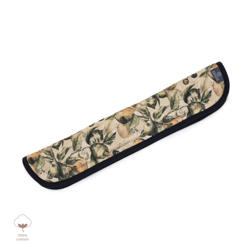 Ochraniacz na pałąk wózka, wykonany z miękkiej dzianiny bawełnianej, zapewniający komfort i ochronę podczas spacerów. Nowy kształt osłonki doskonale dopasowuje się do pałąka wózka, a bawełniana lamówka nadaje jej estetyczny wygląd. Wewnętrzna część ochraniacza wyposażona jest w ukryte zapięcie na rzep, a wypełnienie z antyalergicznej, lekkiej silikonowej włókniny zapewnia dodatkową miękkość.