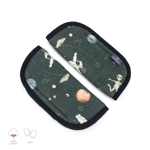 Wewnętrzna część osłonek wyposażona jest w ukryte zapięcie na rzep, a wypełnienie z antyalergicznej, lekkiej silikonowej włókniny gwarantuje miękkość i ochronę przed twardymi pasami samochodowymi czy wózkowym.