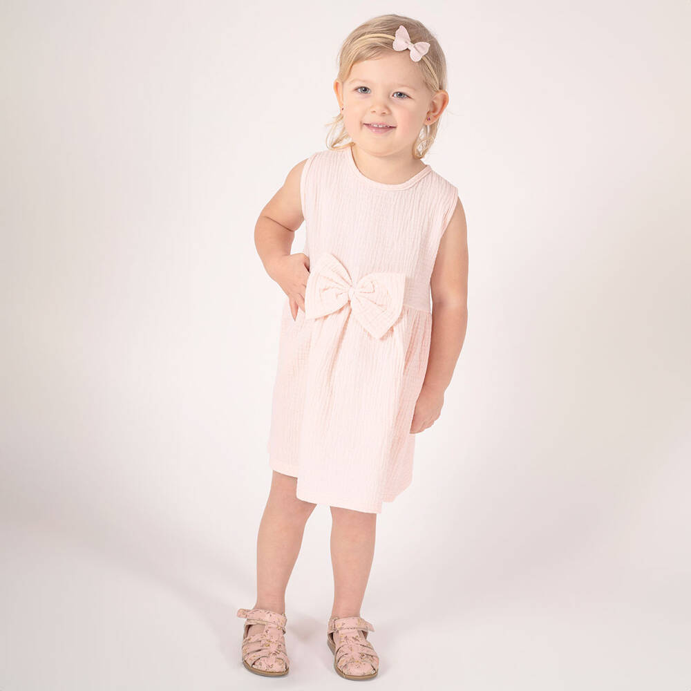 Muślinowa sukienka na ramiączkach dla dziewczynki. Wykonana z białej delikatnej tkaniny. Marszczona na linii talii, przód zdobi duża kokarda. Sukienka z tyłu zapinana na bezniklowe napy. Materiał jest miękki i przewiewny. Idealnie sprawdzi się na gorące lato.