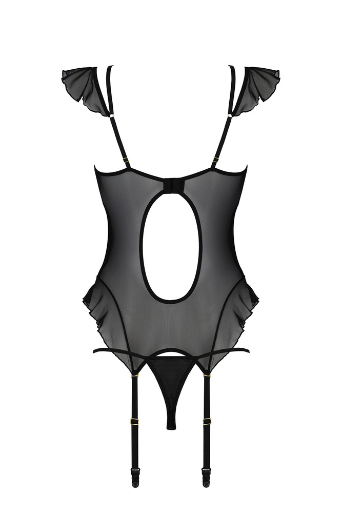 Gorset podkreśla kobiecą figurę, a dołączone do gorsetu stringi idealnie dopełniają całość bielizny jednocześnie podkreślając jej nietypowy, wyjątkowo seksowny charakter.