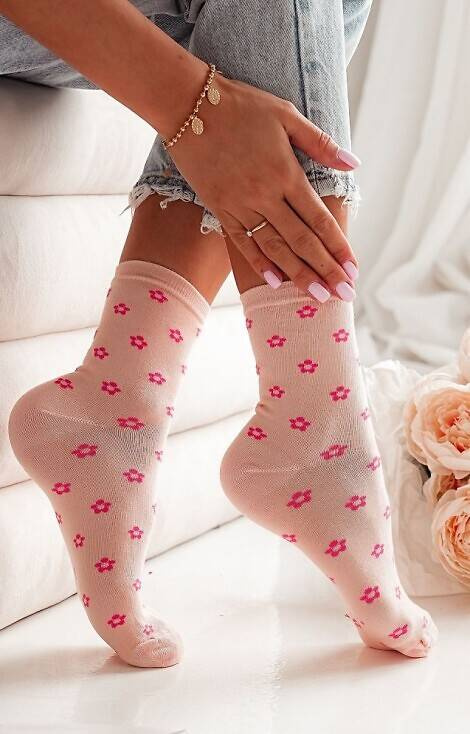 Skarpety damskie wykonane z wysokiej jakości bawełny. Ozdobione wzorem w kwiatki . Doskonale sprawdzą się w codziennych stylizacjach