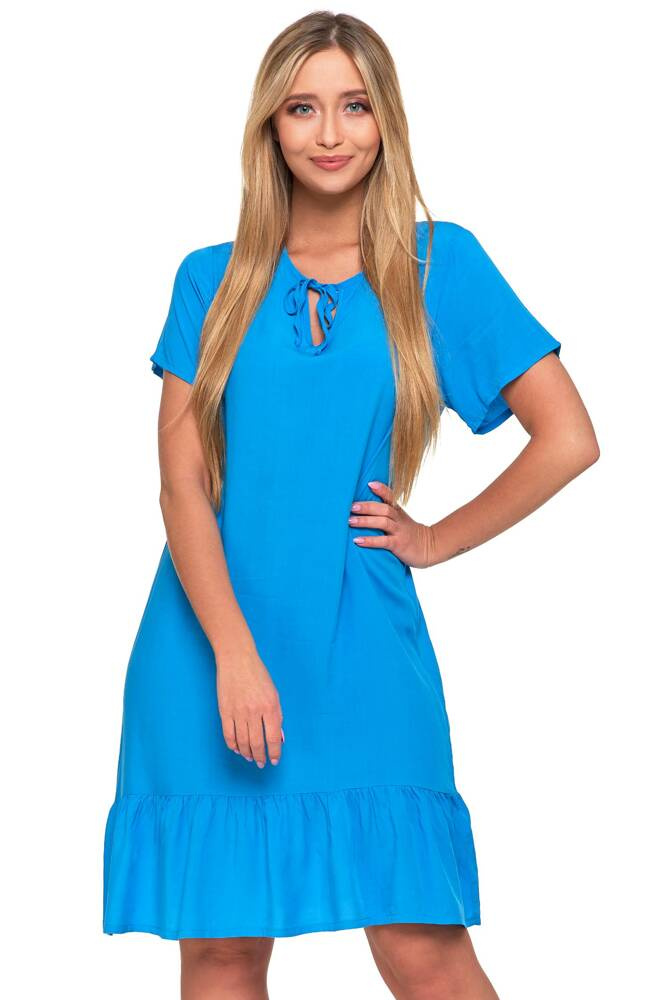 Sukienka ma krótkie rękawy, które dodają jej lekkości i swobody. Wiązany dekolt z delikatną łezką przyciąga uwagę i nadaje wyrafinowanego charakteru, a jednocześnie umożliwia indywidualne dopasowanie. Falbanka u dołu sukienki to subtelny detal, który dodaje gracji i ruchu przy każdym kroku.