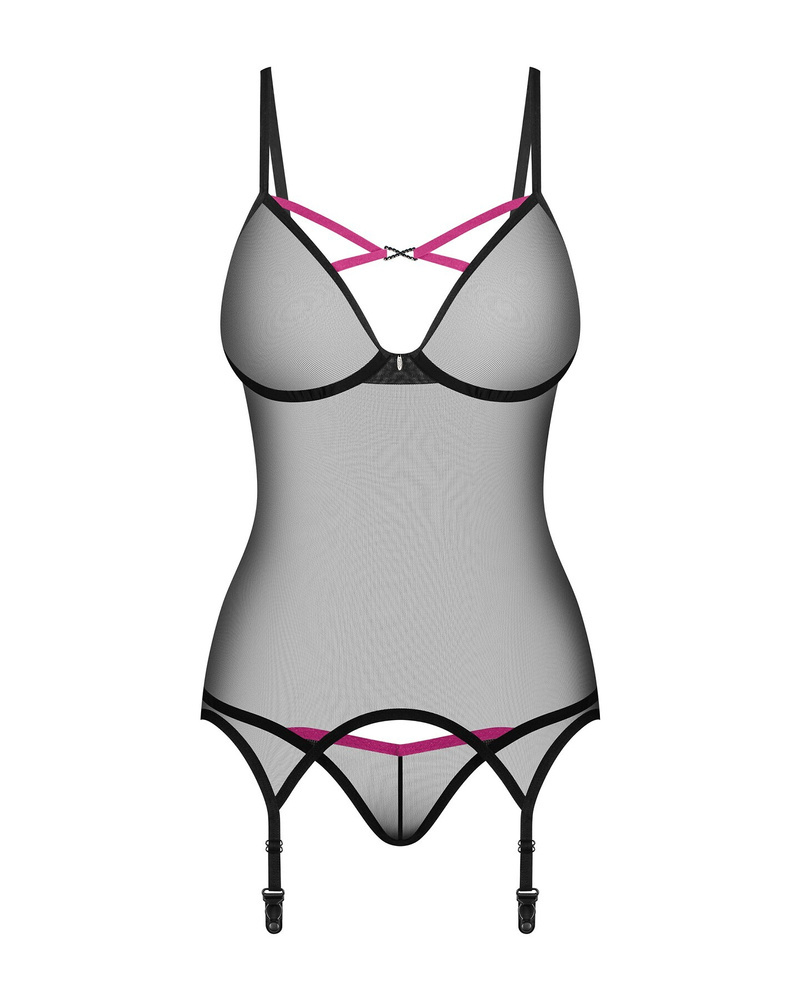 Gustowny komplet, który będzie idealnym uzupełnieniem spotkania we dwoje. Gorset i stringi uszyte z lekko prześwitującego materiału wyróżnia oryginalny, nowoczesny design. Różowe elementy razem z nieodpinanymi paskami do pończoch podkreślają nowoczesny charakter bielizny.