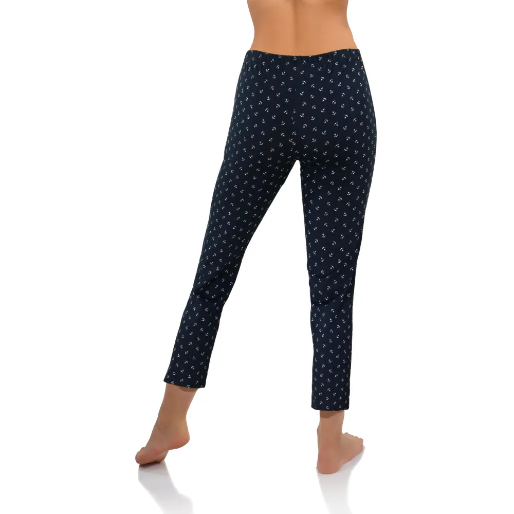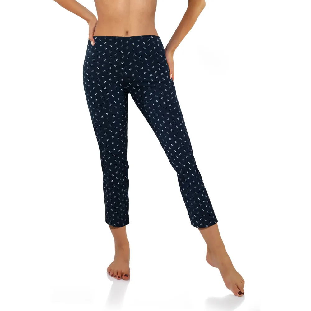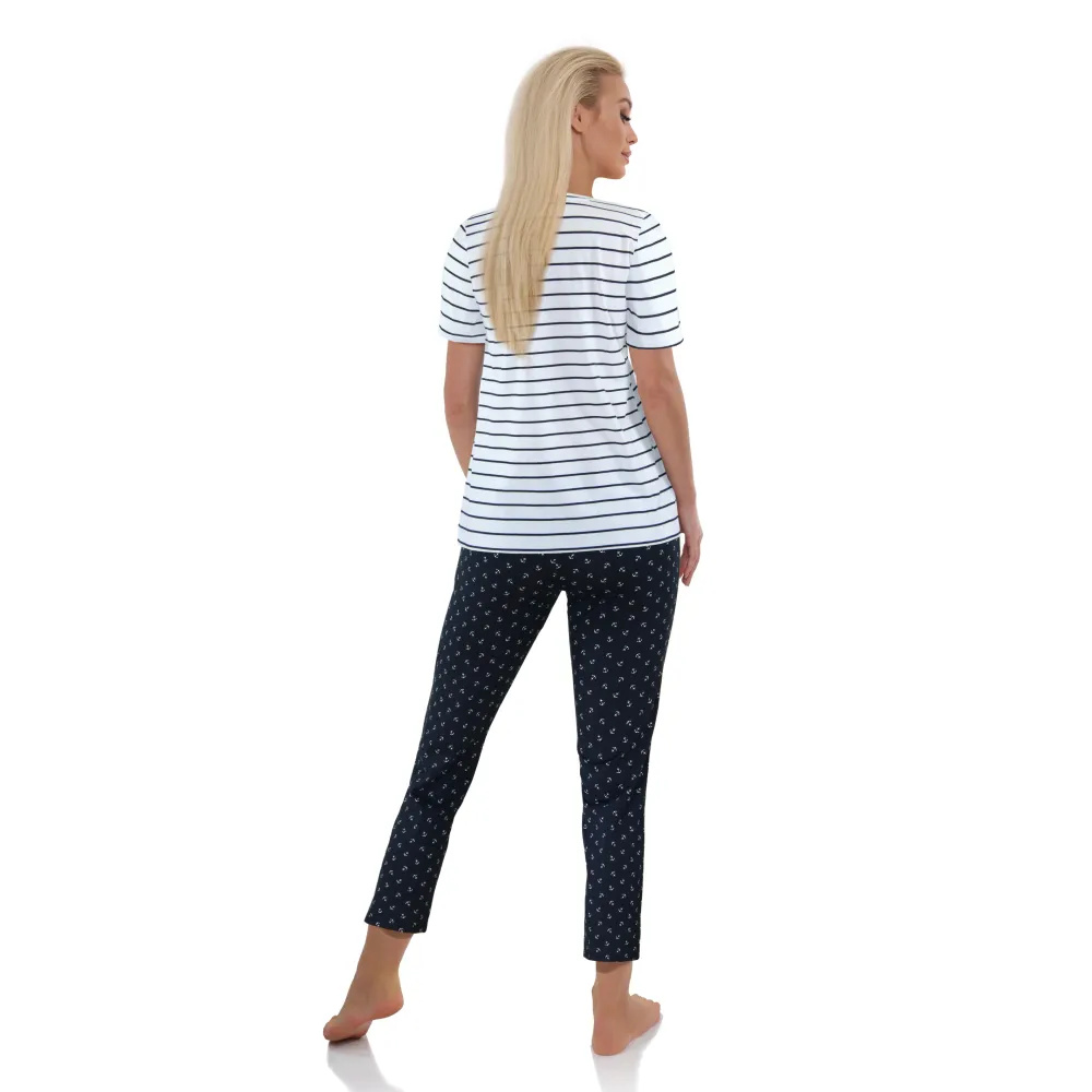 Piżama z krótkim rękawem i spodniami długości 7/8. Koszulka w modne paski z okrągłym dekoltem oraz spodnie w eleganckie kotwiczki, nadają piżamie ponadczasowy, nieco marynarski charakter. Przemyślany krój zapewnia komfort użytkowania i sprawia, że komplet wygląda wspaniale na każdej sylwetce. Idealna do spania ale też jako praktyczny strój domowy.