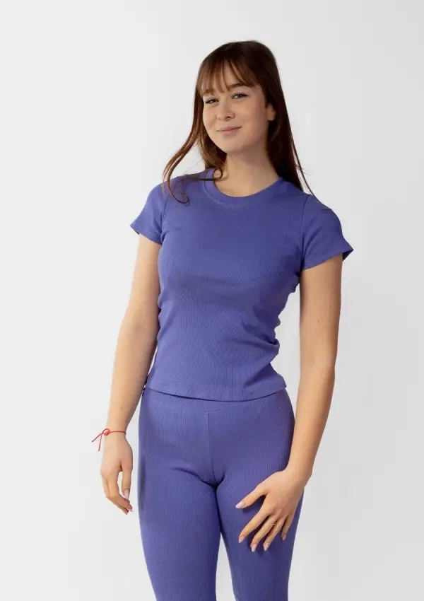 Bluzka damska z krótkim rękawem. Uszyta z wysokogatunkowej prążkowanej bawełny. Można ją nosić z dopasowanymi legginsami podczas treningu, a także zestawić z jeansami czy spódnicą, tworząc stylowy look na co dzień.