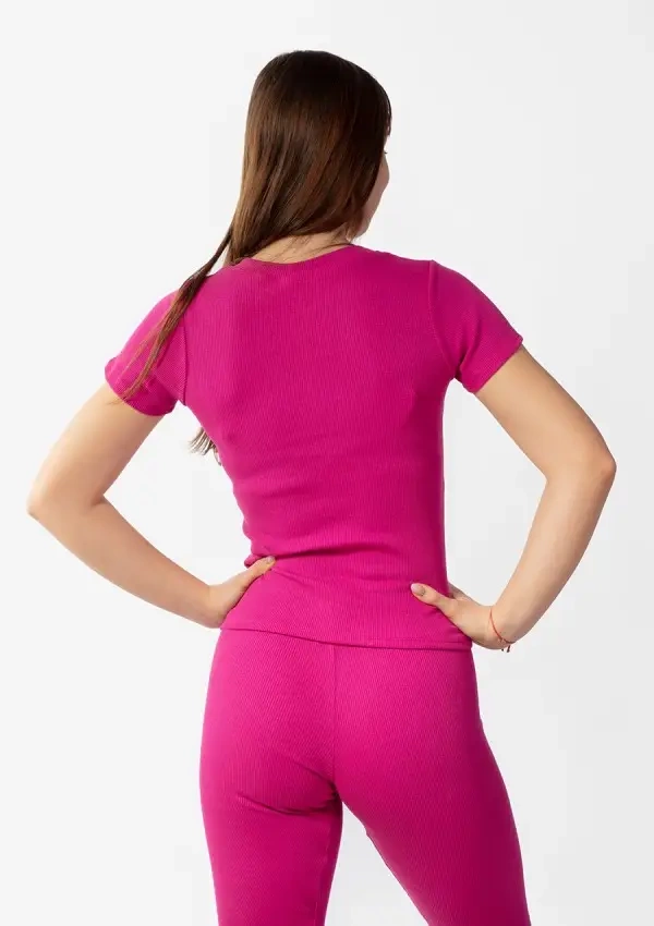 Bluzka damska z krótkim rękawem. Uszyta z wysokogatunkowej prążkowanej bawełny. Można ją nosić z dopasowanymi legginsami podczas treningu, a także zestawić z jeansami czy spódnicą, tworząc stylowy look na co dzień.