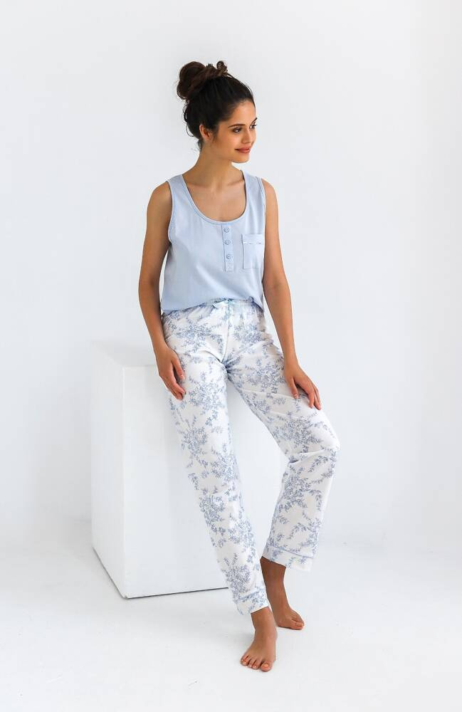 Komfortowa piżama damska. Uszyta z wysokogatunkowej bawełny, która daje maksymalny komfort noszenia. Koszulka na szerokich ramiączkach. Do kompletu wzorzyste ,długie spodnie. Całość prezentuje się doskonale. Bardzo wygodny fason, delikatnie dopasowany do ciała. Spodoba się kobietom, które uwielbiają delikatność i swobodę.