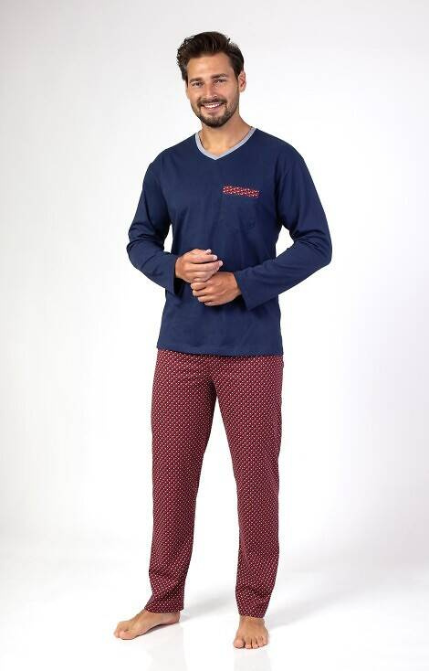 Piżama męska z wysokiej jakości bawełny. Koszulka z długim rękawem, dekolt w kształcie litery "V". Na wysokości klatki piersiowej mała kieszonka. Spodnie długie w kratę